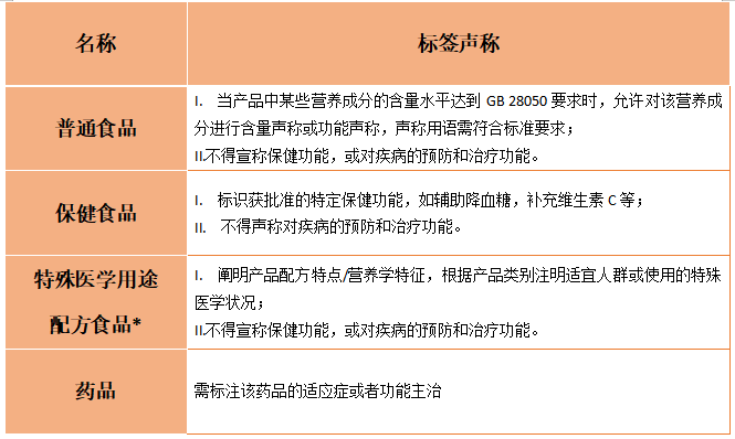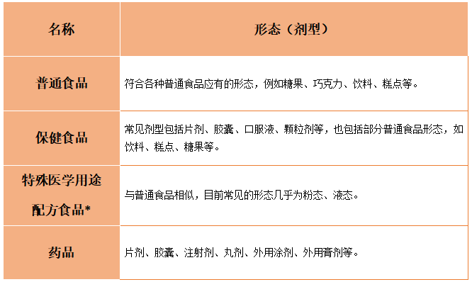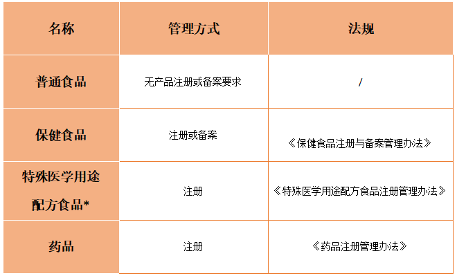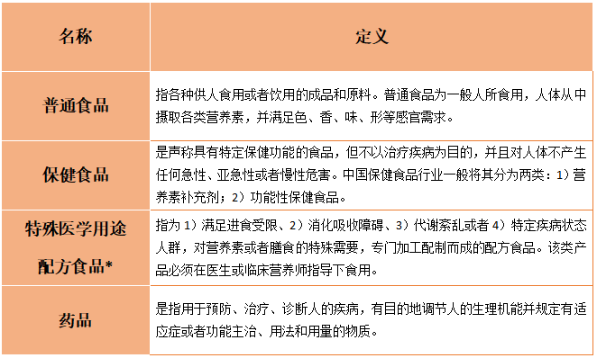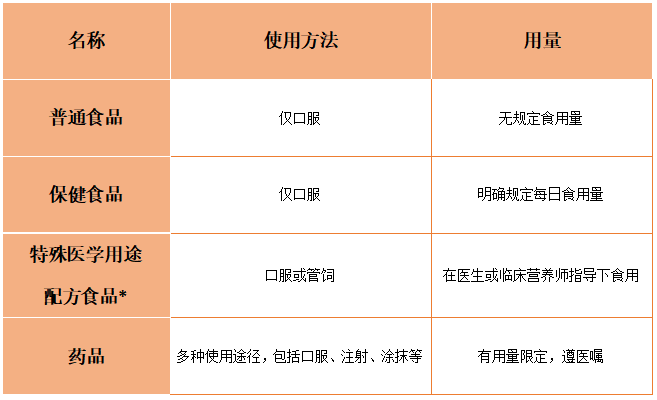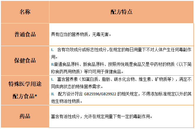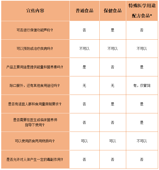 下表总结了普通食品、保健食品、特殊医学用途配方食品三类食品的常见区别。