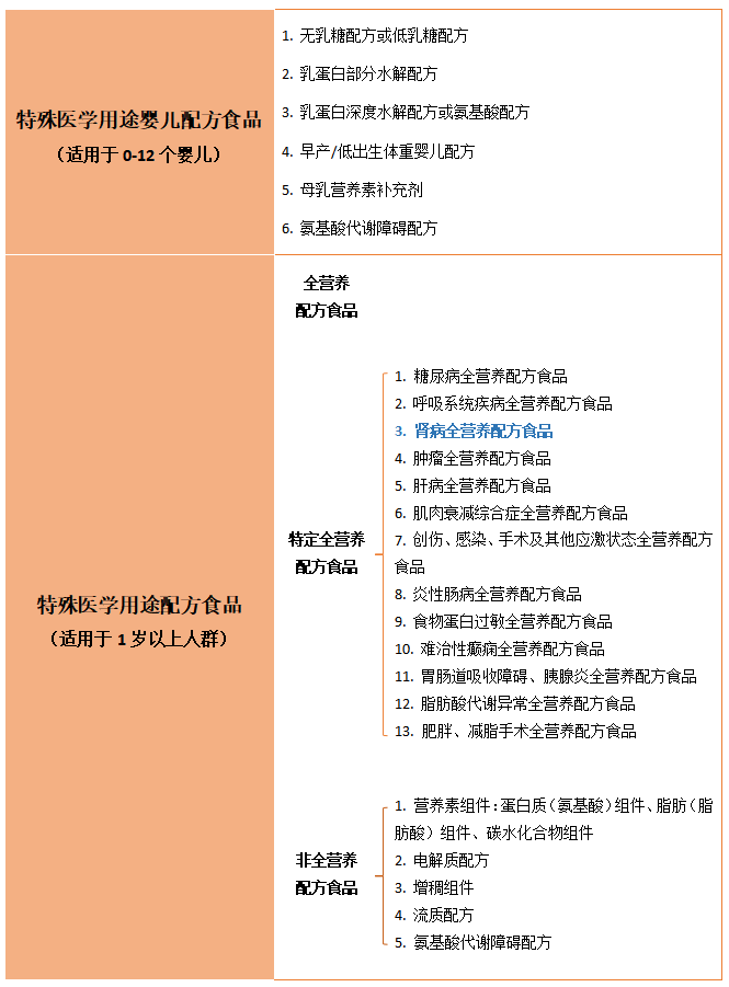 目前,我国现有的特殊医学用途配方食品类别如下: